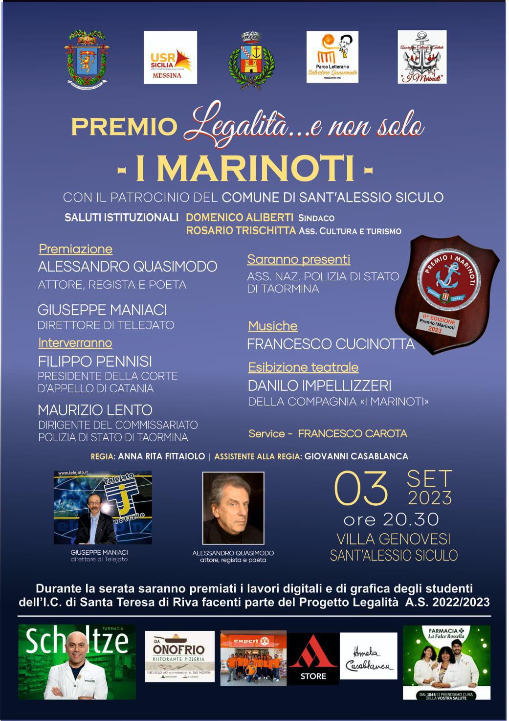 Il 03 settembre 2023 alle ore 20,30 presso la Villa Genovesi si terrà la II edizione del "Premio Legalità e non solo "I MARINOTI".